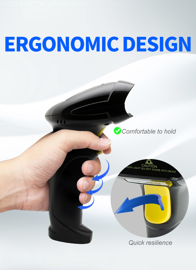 | Product features | ●Using a high-speed laser scanning engine to efficiently read various ultra long 1D barcode ●Compatible with many kinds of device/system, plug and play ●Ergonomic design, comfortable operation, not easily fatigued for long time operation ●LED indicator light and beep sound for quick feedback on working conditions ●Support manual, continuous scanning, can switch freely ●Can read up to 100bytes Febraban(Brazil Bank Code) |